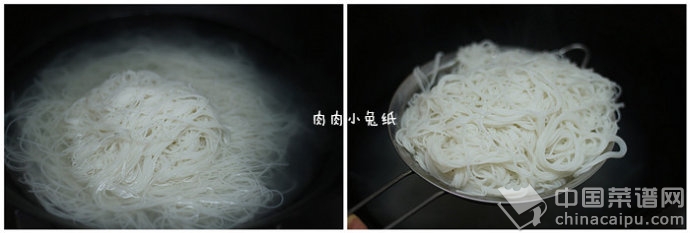 1、米粉在溫熱的水中浸3分鐘撈出,再放入冷水中浸2分鐘。