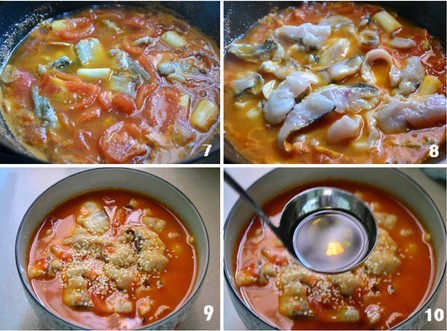 8、待鍋內(nèi)湯汁濃稠時,調(diào)入鹽攪勻,去掉魚片里的
