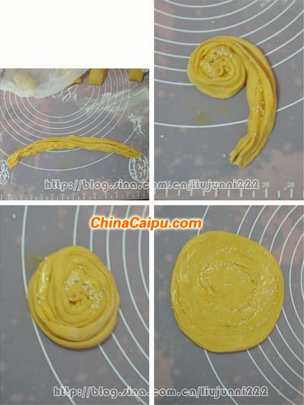 6.將面皮沿長邊抓疊成長條狀,由一頭開始將其盤卷起來,再用搟面杖將其搟成約0.3厘米厚的圓
