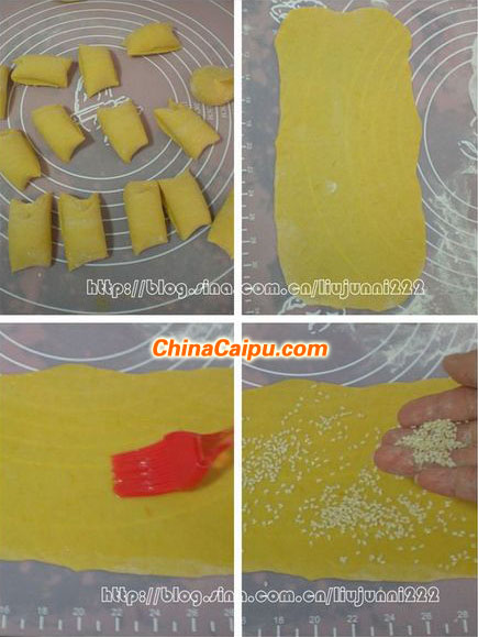 5.在搟好的面皮上刷上一層融化的奶油,再撒上熟芝麻;