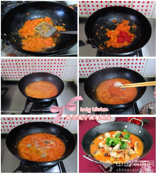 8 加入番茄醬繼續(xù)煸炒至出紅油。