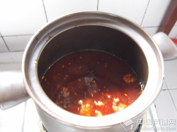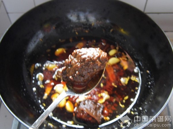 6.然后開中火放入3勺郫縣豆瓣醬,2勺東北大醬爆香出紅油