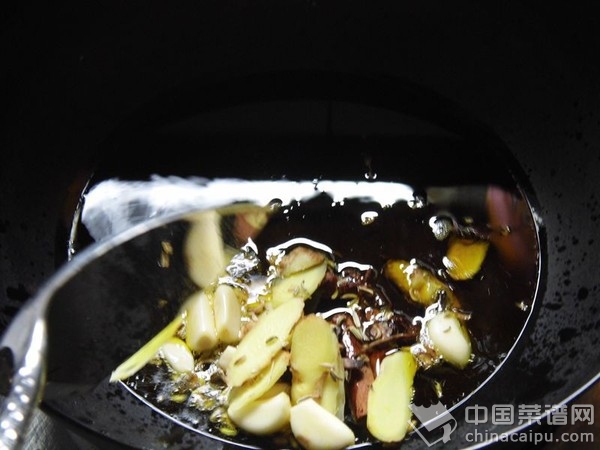 5.鍋里熱油,油熱后關(guān)小火加姜、蒜和所有香料炒香