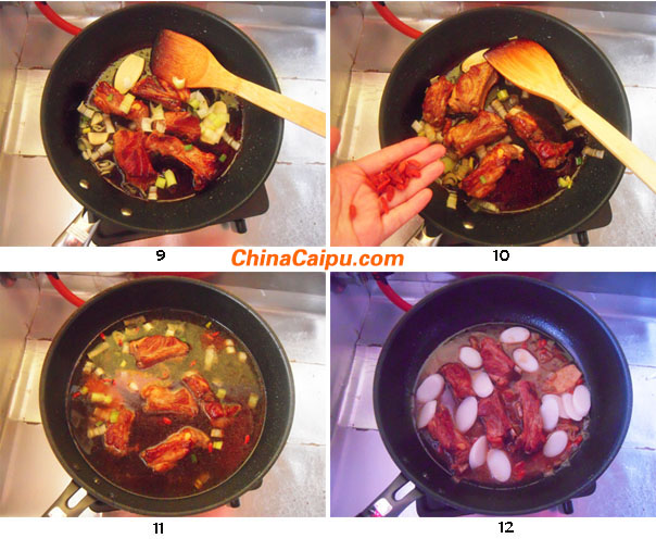 11.倒入溫水沒過排骨表面即可,大火燒開后轉(zhuǎn)小火燒至湯汁濃稠。