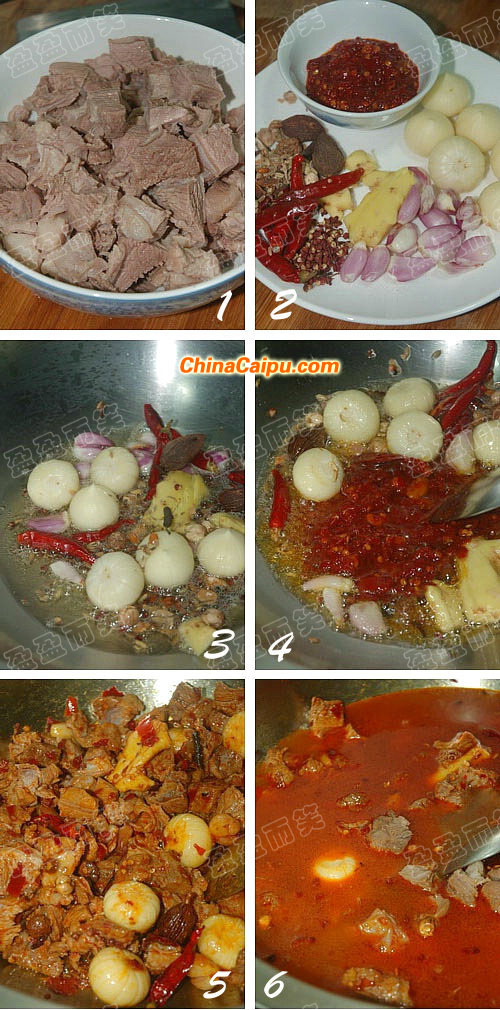 牛肉切稍大塊,氽水后撈起,改刀小塊,煮牛肉的湯不要倒掉,放一邊,撇去浮沫后備用