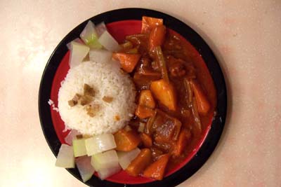 紅燒牛肉蓋到飯面上就可以了,喜歡吃蔬菜的加點蔬菜即可。