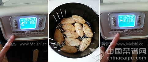3.首先打開空炸鍋點(diǎn)預(yù)熱鍵預(yù)熱3-5分鐘,將腌好的雞翅排入炸籃中,按下