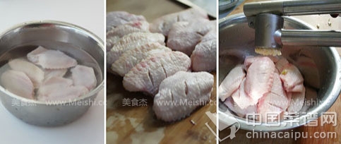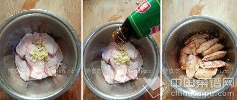 血水,充分瀝干水份,兩面用刀劃開,蒜壓成蓉加入雞翅中