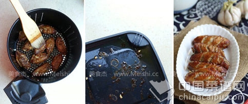 4.15分鐘左右取出炸籃,翻面刷料,撒入蒜末,繼續(xù)炸制5分鐘既可。可以看到制做中不僅沒有使用一滴油,空炸鍋還將食物本身多余油脂瀝出,裝盤既可