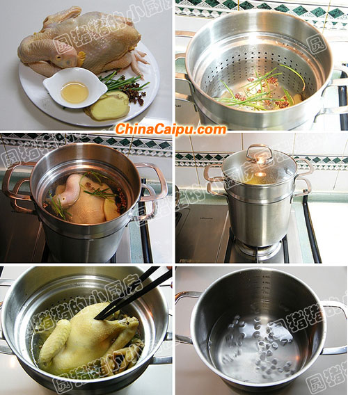 6.取出浸熟的雞,倒出深鍋內(nèi)的雞湯備用,在深鍋內(nèi)放入2/3量的冰水。