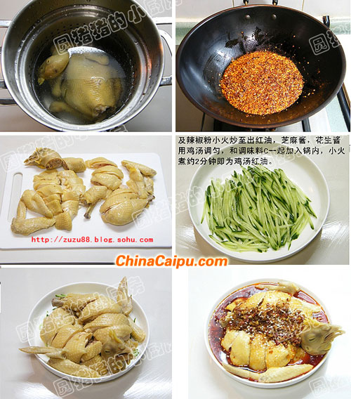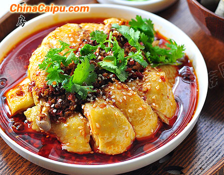 口水雞本身無(wú)味,是要浸在紅油雞湯內(nèi)才有味道。