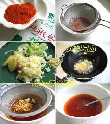 ??? 3)蔥姜蒜洗凈,切碎。起鍋,倒入油,待6成熱時(shí),放入蔥姜蒜碎,爆炒出香味,關(guān)火,沖入辣椒粉中,沉淀后瀝出的油就是紅油了。(備注:如果沒有過濾網(wǎng),將蔥姜蒜撈出后,再將油沖入辣椒粉中。)