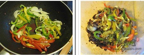 3、鍋中留底油,下入洋蔥絲和圓椒絲爆香。撈出,可與雞丁置于同一容器中,備用。