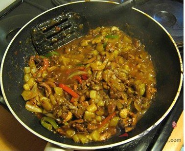 5、下入雞丁、洋蔥絲和圓椒絲,將鍋中