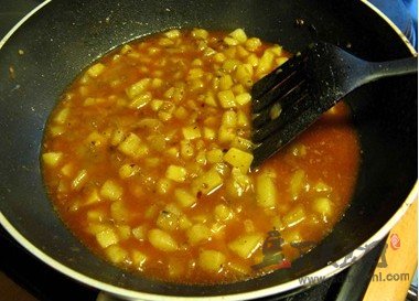 4、土豆在這里有兩種做法:喜歡吃爽口生脆的土豆丁的朋友,備料時(shí)需準(zhǔn)備新土豆,然后大油,土豆丁下油鍋直接翻炒;而我喜歡吃酥軟的土豆丁,采用大火熱水煮土豆丁8-10分鐘。后加入