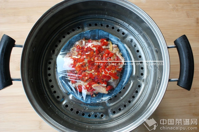 5. 將腌制好的雞塊鋪在盤中,再均勻地澆上剁椒,然后用保鮮膜蓋起來,用牙簽在保鮮膜上戳幾個小孔;