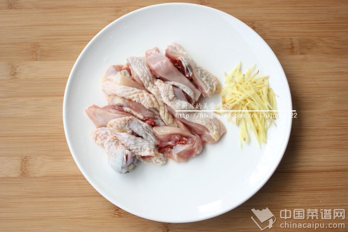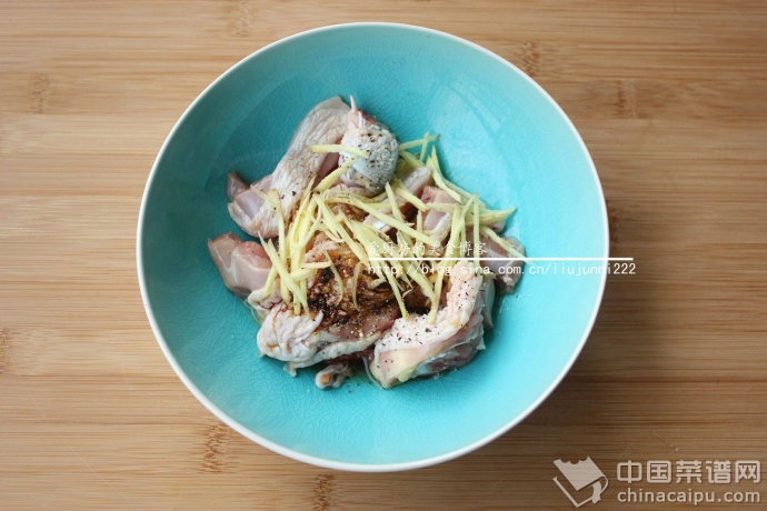 3. 雞塊中放入姜絲、料酒、醬油、鹽、白糖、黑胡椒碎;