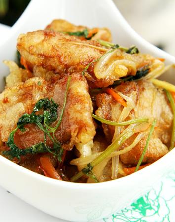 5、將火調(diào)至大火,放入炸過(guò)的肉片,大火炸至焦脆、上色,我炸得還不是太焦,一般飯店炸得比這個(gè)還要焦一些,我喜歡稍軟一點(diǎn)的口感;