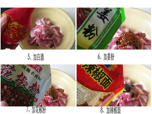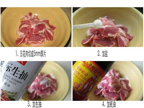 2、五花肉切5mm厚片,加各種調(diào)料腌漬10分鐘。