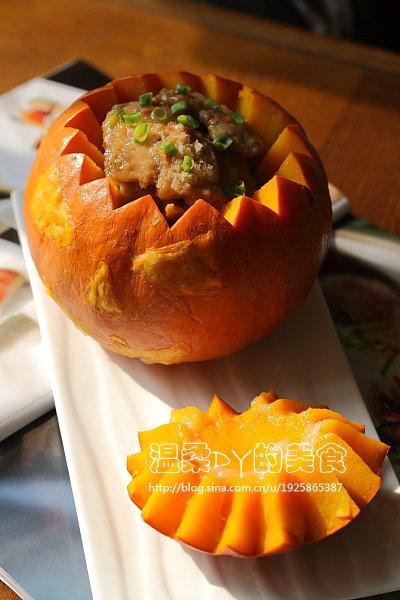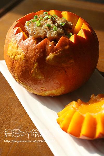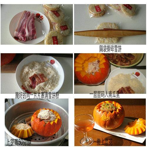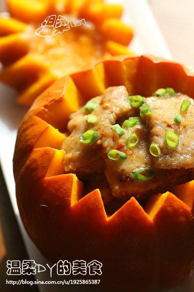 4、腌好的肉片一片片裹上米粉,碼入南瓜盅,上籠蒸50分鐘。