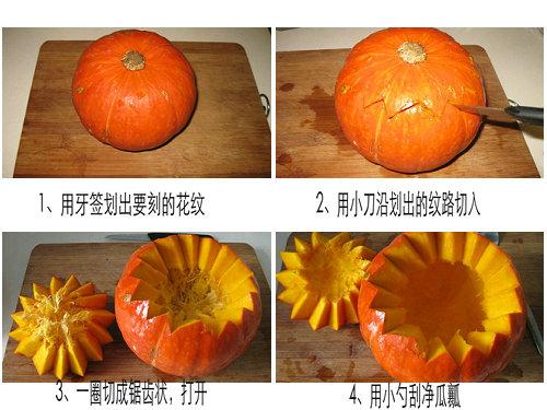 1、南瓜洗凈,用牙簽劃出鋸齒紋,用小刀沿花紋扎透,分開(kāi)蓋子和南瓜盅,用小勺挖去瓜瓤,刮凈內(nèi)壁備用。