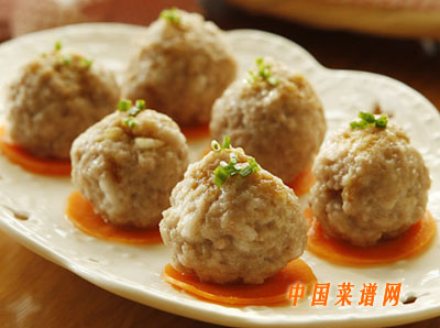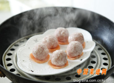 7:將做好的肉丸子放在胡蘿卜片上,裝入盤中。蒸鍋內(nèi)加入適量的水燒開,放入肉丸子大火蒸8分鐘左右,熟透即可。