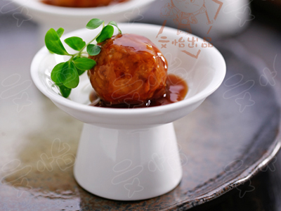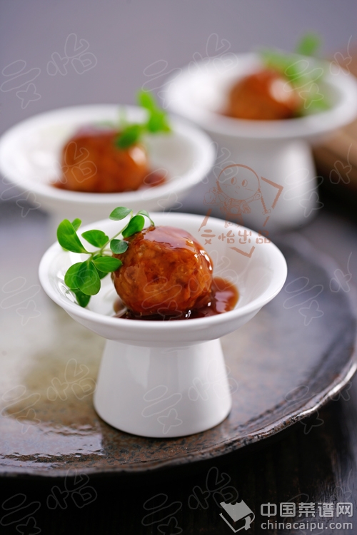 4)鍋中加入雞湯,將剩余生抽(10ml),老抽(3ml),鹽(1克),糖(2克)放入湯中攪勻。最后放入丸子,用中火煮3分鐘后,轉(zhuǎn)大火淋入水淀粉收濃湯汁。