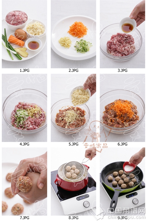 3)手心抹上薄薄的一層油,取一小團(tuán)肉餡從虎口部位擠出丸子,來(lái)回在手掌心摔幾下,使它更好的成團(tuán),所有丸子做好后,涼水下鍋,大火煮開后,煮至丸子飄起成熟后撈出瀝干。