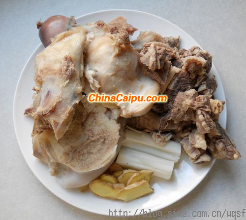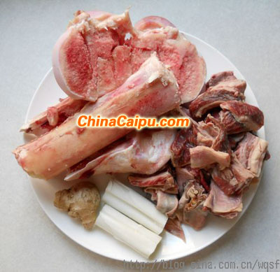 材料:牛大骨1200克、牛肋條肉600克、生姜20克、大蔥30克