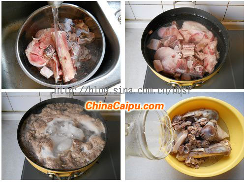 1. 牛大骨又大又硬,在市場(chǎng)買的時(shí)候請(qǐng)商家給剁成小塊;牛肋條肉切成3厘米見方的小塊。