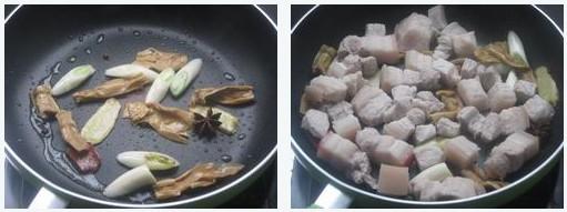 4、鍋中倒入少許油,油熱后,放入蔥、姜、花椒、八角、桂皮、筍干爆香,放入五花肉煸炒,調(diào)入料酒、白糖、老抽、生抽翻炒上色,加入清水沒過肉面,用大