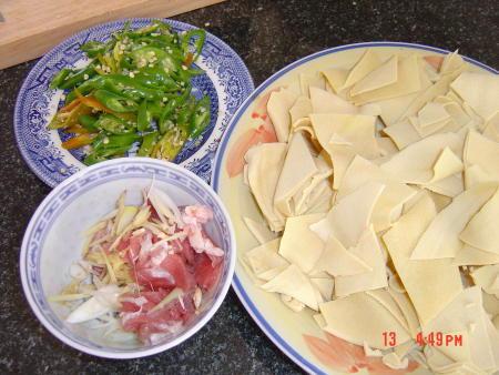 1.干豆腐切菱形塊,肉切小薄片(一點(diǎn)就夠),蔥花、姜絲,尖椒斜刀切菱形塊