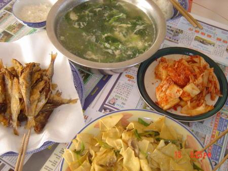 加一個晚餐圖,尖椒干豆腐,炸小魚,自制辣白菜,菠菜蛋花湯