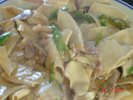 2.倒油適量,8成熱時放入肉、蔥花、姜絲一起炒,肉變色時放少許料酒和醬油,再倒入尖椒翻炒,辣味出來后放入切好的干豆腐,翻炒幾下后放入適量鹽和味精調(diào)味,再放入1碗半的雞湯(水也行,我這是正好有,碗就是普通的飯碗,途中裝肉的的那個),攪拌均勻燉一小下,因?yàn)楦啥垢容^干,燉一下好入味,湯收的差不多后勾一點(diǎn)濃芡翻一下就可以出鍋了.