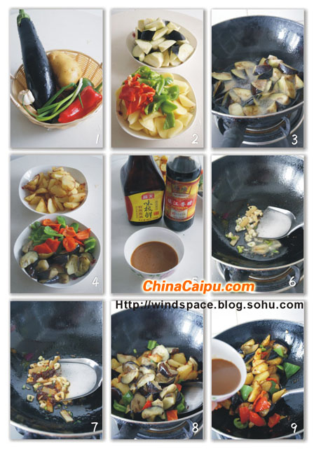 微波爐高火轉2、3分鐘。然后油鍋放少許油,將茄子略炸1分鐘,土豆炸2分鐘至表皮有些許泛金黃。青紅椒炸20秒左右。