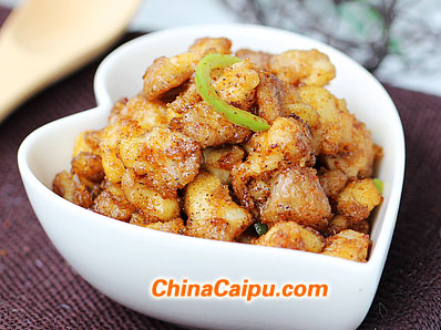 2.腌制好的雞脆骨加入少許淀粉拌勻,鍋中倒入適量的植物油燒至180度左右,加入雞脆骨炸至金黃色后撈出備用。