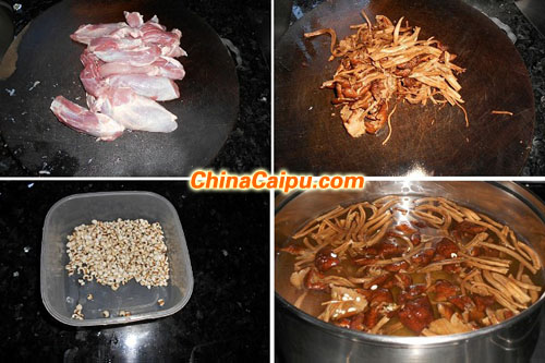 2. 茶樹菇用水泡發(fā),去根蒂,切段。
