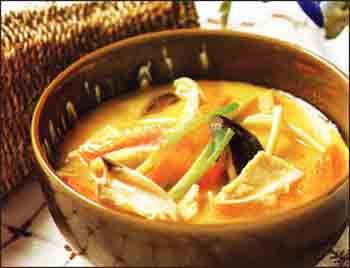 3、注入清湯、紅蘿卜煮15分鐘,再調(diào)入鹽、味精、雞精粉,用中火煮5分鐘,倒入湯碗內(nèi)即成。