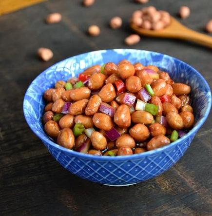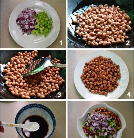 用料:花生米150克 陳醋3湯匙 香芹1根 洋蔥半個(gè) 花生油3湯匙白酒3滴 李錦記醬油2湯匙 鹽適量 糖半湯匙