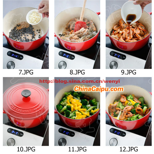 4) 鐵鍋中倒入一點(diǎn)點(diǎn),中火加熱,待油4成熱時(shí),放入豆豉煸炒出香味,然后到蔥姜碎炒香,馬上倒入蝦翻炒。