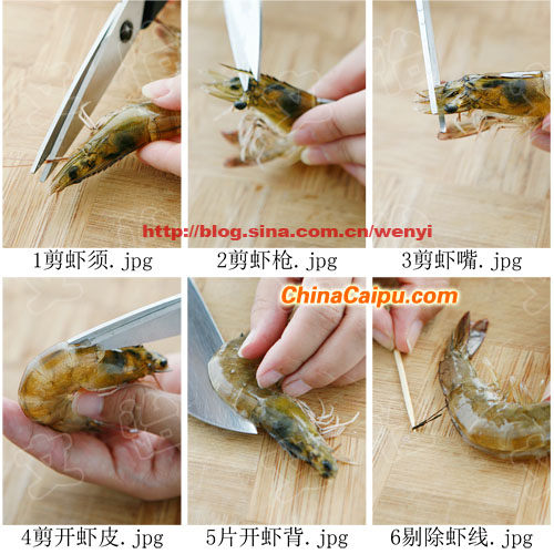 1) 先用剪刀剪去蝦須,和位于蝦頭上方的蝦槍(以免吃的時(shí)候扎手),再剪去蝦“嘴”。用剪刀從蝦頭至蝦尾