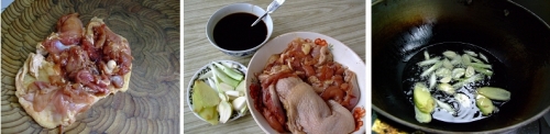 1 雞腿洗凈,剔去腿骨,在肉厚地方劃幾刀,放入腌制料,抓勻,腌制10分鐘。