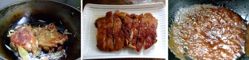 4 將腌制好的雞腿放入鍋內(nèi),雞皮朝下,中火煎至兩面焦黃。
