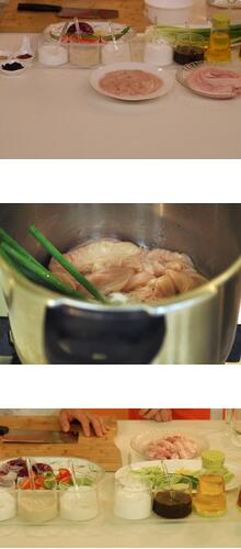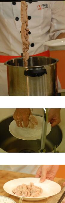 3.大腸煮至可用筷子輕松穿過(guò)時(shí)表示已經(jīng)熟了,撈出過(guò)涼水后取出切2厘米長(zhǎng)的件備用。