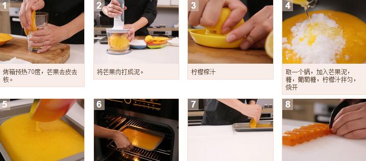 1.烤箱預(yù)熱70度,芒果去皮去核,取芒果肉打成泥,檸檬榨汁