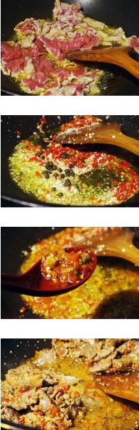5 鍋中留底油,放入辣椒 姜蒜 花椒小火炒香,放入滑過油的牛肉片翻炒均勻,加入,鹽調味起鍋,撒上香菜就好了