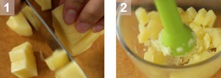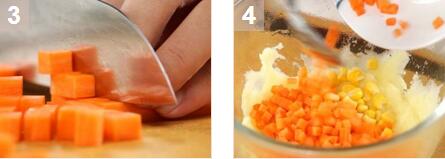 1.土豆洗凈后去皮切小塊,放入蒸鍋隔水蒸熟,取出壓成土豆泥,胡蘿卜洗凈后切丁
