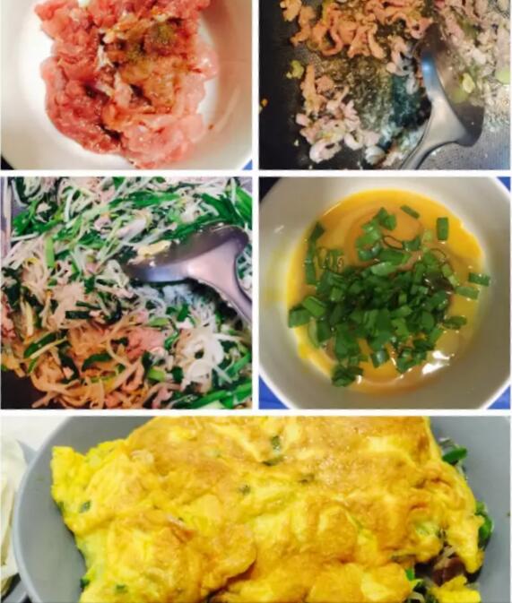炒合菜的材料:豬里脊肉,韭菜,豆芽,粉絲,雞蛋,香蔥