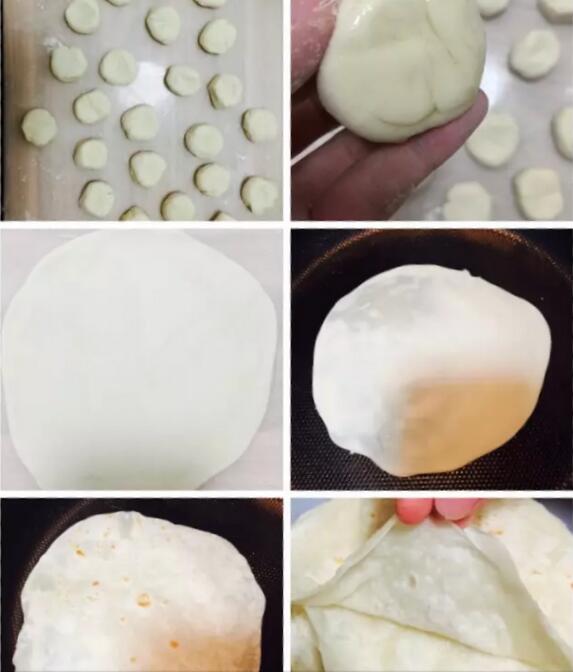 6.平底鍋燒熱,直接將面片放入平底鍋內(nèi),小火干烙,當(dāng)面皮稍微上色后即可翻面,將兩面烙成同樣色澤即可