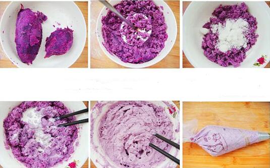 1、紫薯兩個約200g,蒸熟去皮,放一大碗中用壓土豆泥的工具碾成泥,加入20g細(xì)砂糖,50g奶油,用電動打蛋器以低速攪打至順滑;